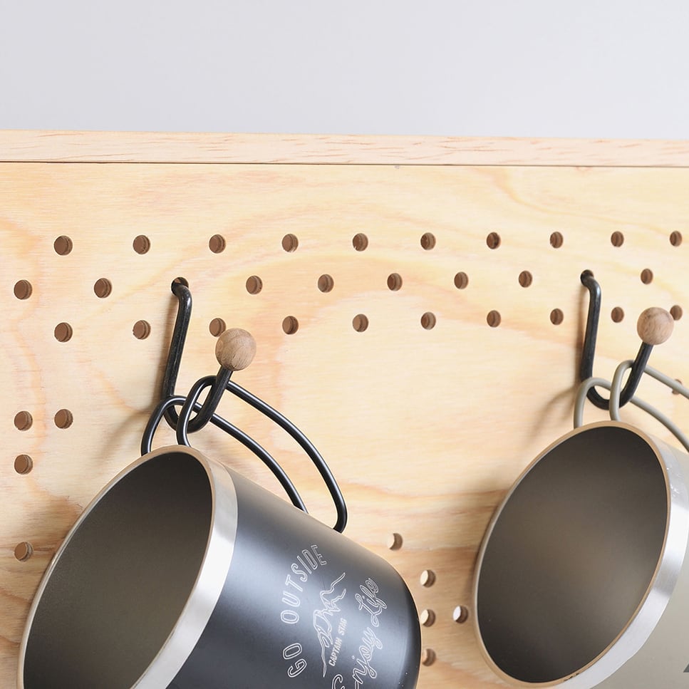 金属部には焼付塗装、先端のウッドボールはダークウォルナット色のオイルステインを施し、アンティーク感のあるフックに仕上がっています。